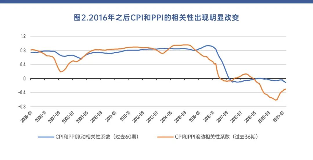 我们计算了不同周期下CPI和PPI的滚动相关系数,结果表明,PPI和CPI的相关性在2016年前后出现了很大的结构性变化。如图2所示,2016年之前,PPI和CPI的当期滚动相关性比较稳定,除了2008年金融危机期间,3年期和5年期滚动相关性均在0.8左右。但2016年之后,3年期滚动相关系数快速下降,随后是5年期滚动相关系数在2017年快速下降。