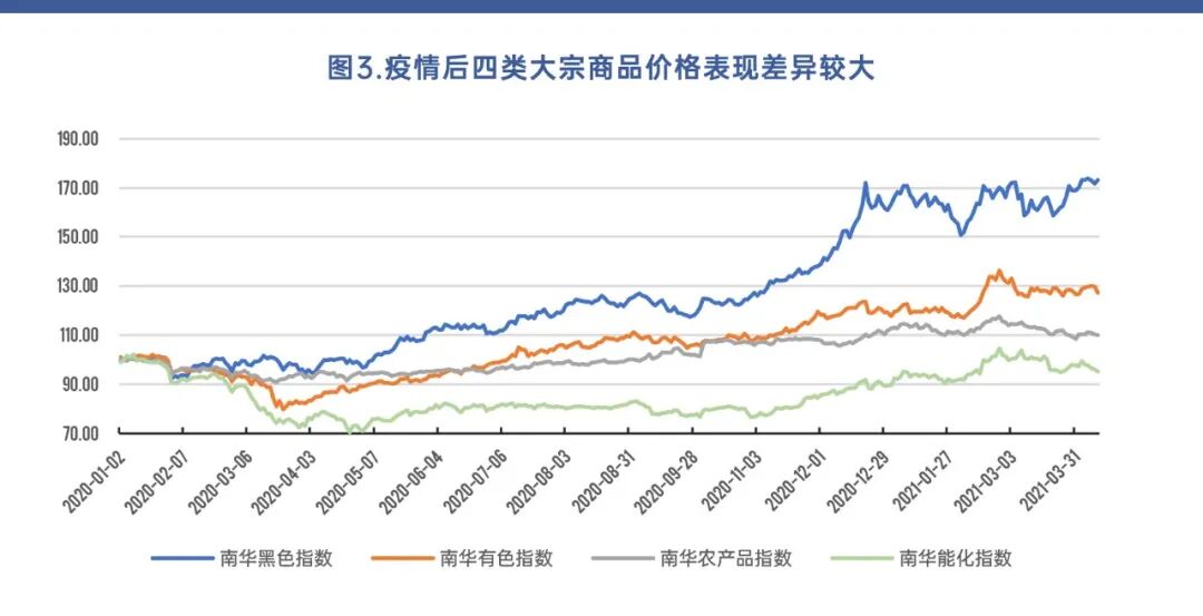 本轮大宗商品价格上涨过程中,不同类产品价格表现有很大差异。换言之,大宗商品价格上涨只是一个粗略的描述,不能一概而论。我们以2020年1月2日的价格为基期,观察黑色、有色、能化和农产品四大类大宗商品在疫情之后的价格变化。如图3所示,与疫情之前相比,黑色涨幅最大(71%),其次是有色(27%),农产品的涨幅相对温和(10%),而能化还没有完全回到疫情之前的水平(-5%)。