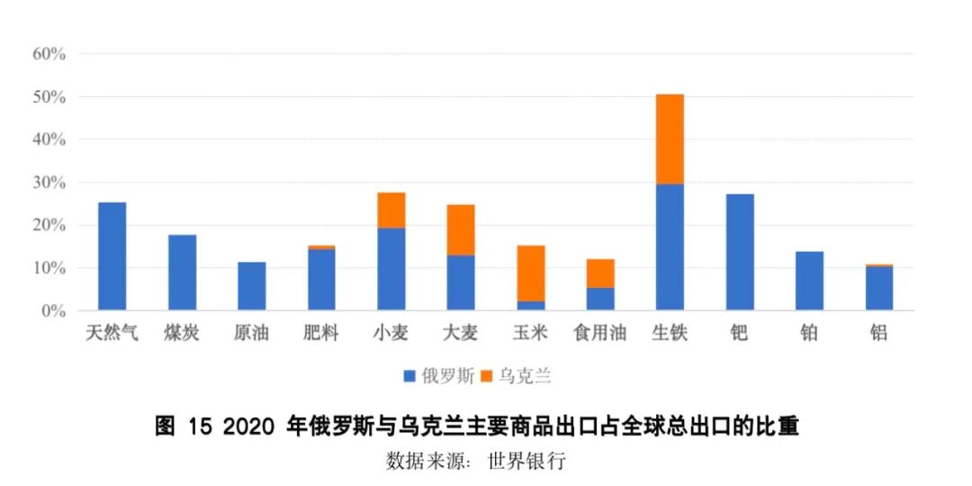 二是俄乌冲突引发的全球能源和粮食等问题。俄罗斯是全球最主要的油气生产国之一,俄乌均是世界主要的粮食、油料作物、化肥和金属原料生产国和出口国。如图15所示,主要商品类别的出口份额占比均超过10%,天然气、小麦、大麦、钯等商品的出口在全球出口中的占比超过了20%。