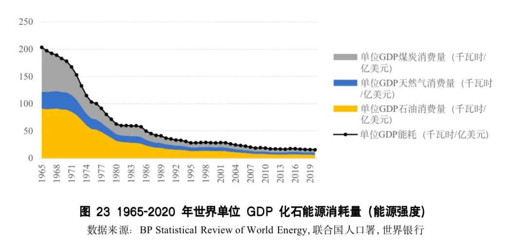 上世纪中叶至今,得益于生产效率提升、产业发展和清洁能源利用等因素,全球整体能源强度急速下降。如图23所示,截至2020年,全球的单位GDP能耗量仅为15千瓦时/百万美元,远低于上世纪70年代119千瓦时/百万美元的年均水平。特别是石油的能源强度在过去50多年里大幅下降,从1970年的178千瓦时/百万美元的年均水平,到2020年仅为6千瓦时/百万美元。这也意味着,相较1970年代,能源价格冲击对通胀水平和经济的影响程度已大幅削弱。