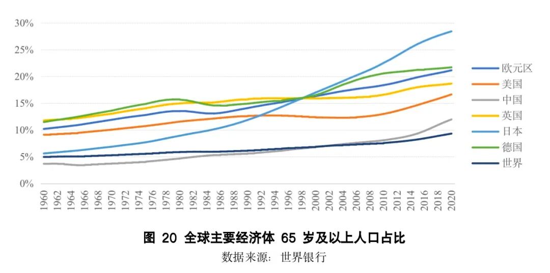 第四、人口老龄化。从图20可以看出,当前全球面临较严峻的老龄化形势,全球65岁以上的人口占比已经从1960年的4.97%上升至2020年的9.32%。主要发达经济体的老龄人口占比基本都超过15%。古德哈特在《人口大逆转:老龄化、不平等与通胀》一书中的观点,当大量人口进入劳动力市场时,对供给的促进超过对需求的提升,是一个去通胀的力量。但当人口老龄化导致越来越多的人口退出劳动力市场时,这种动态将反转——对供给的拖累超过需求的下降,因此是一个抬升通胀的力量。