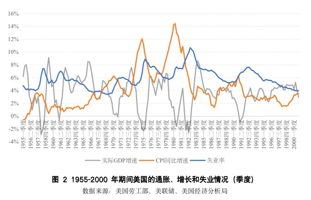 美国经济在上世纪70年代呈现出明显的“两高一低”特征。其中,“两高”为“高通胀”与“高失业率”,“一低”为“低增速”。美国在上世纪60年代的年均实际GDP增速为4.5%,至70年代滑落至3.2%。通胀率从上世纪60年代中前期不及2%的水平,到80年代初接近15%。失业率在60年代末一直在3.5%的低位徘徊,但到整个70年代,美国年均失业率高达6.2%。