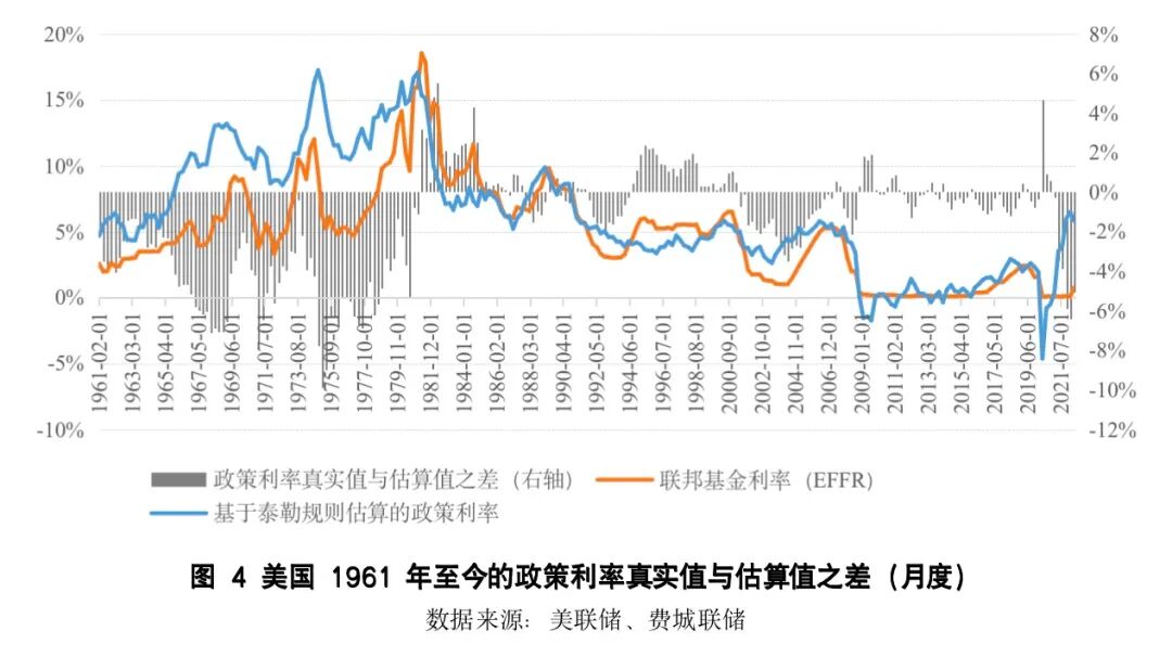 衡量美联储的政策错误有很多方式,一个简单的方法(也是事后诸葛亮的做法)就是比较一下美联储实际采用的政策利率和根据泰勒规则并且已经知道所发生的一切之后倒推出来的政策利率之间的差距。