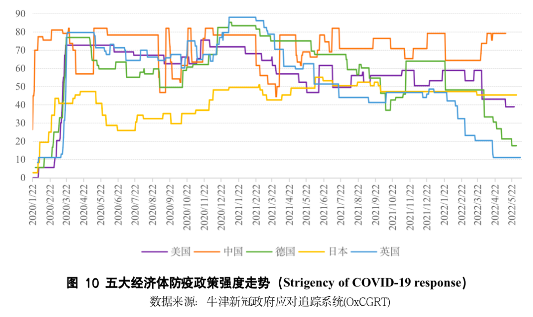 一是新冠疫情的影响及其对全球产业链产生的短期冲击。新冠疫情暴发两年多以来,疫情一直用各种方式影响全球产业链的正常运转。第一、各国为控制疫情所采取的控制行为对人流和物流都不可避免产生了影响。图10是牛津新冠政府应对追踪系统(OxCGRT)计算的政策反应强度指数所衡量的各国疫情防控程度。从五大主要经济体的情况来看,亚洲两国的防疫强度明显高于欧美国家,而且各国都仍保持着或高或低的疫情防控措施,仍未回到疫情前的状态。
