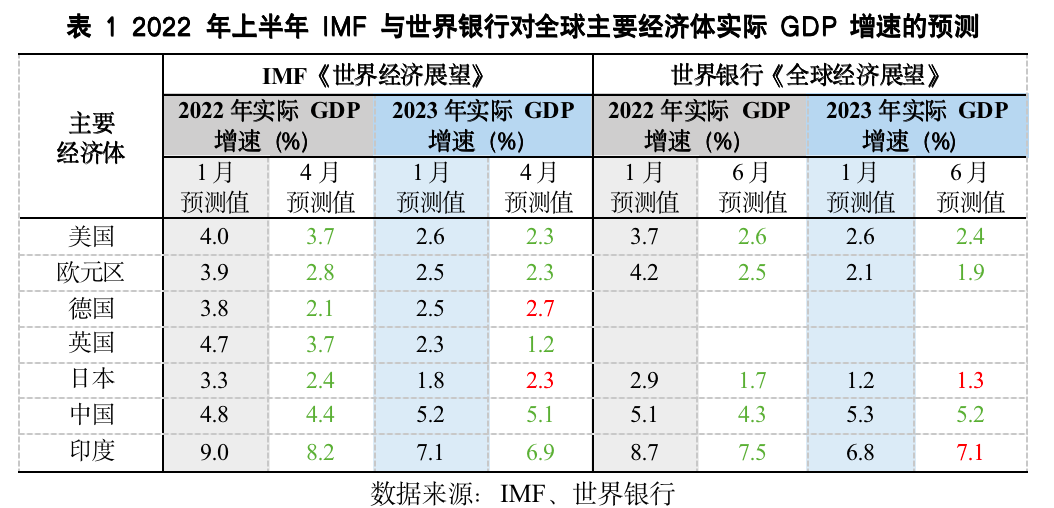 分国别来看,俄乌冲突爆发后,主要国际机构对欧洲的增长前景更偏悲观。IMF在4月下调了主要经济体在2022年的经济增速预测值,其中对德国、欧元区、日本和英国的下调幅度较大,分别为1.7、1.1、1.1和1.0个百分点,对美国、中国和印度的调整幅度相对较小,仅为0.3、0.4和0.8个百分点。世界银行在6月的预测中,进一步下调了对主要经济体的增速预测,欧元区、日本、印度、美国和中国分别较年初的预测值下降1.7、1.2、1.2、1.1和0.8个百分点。