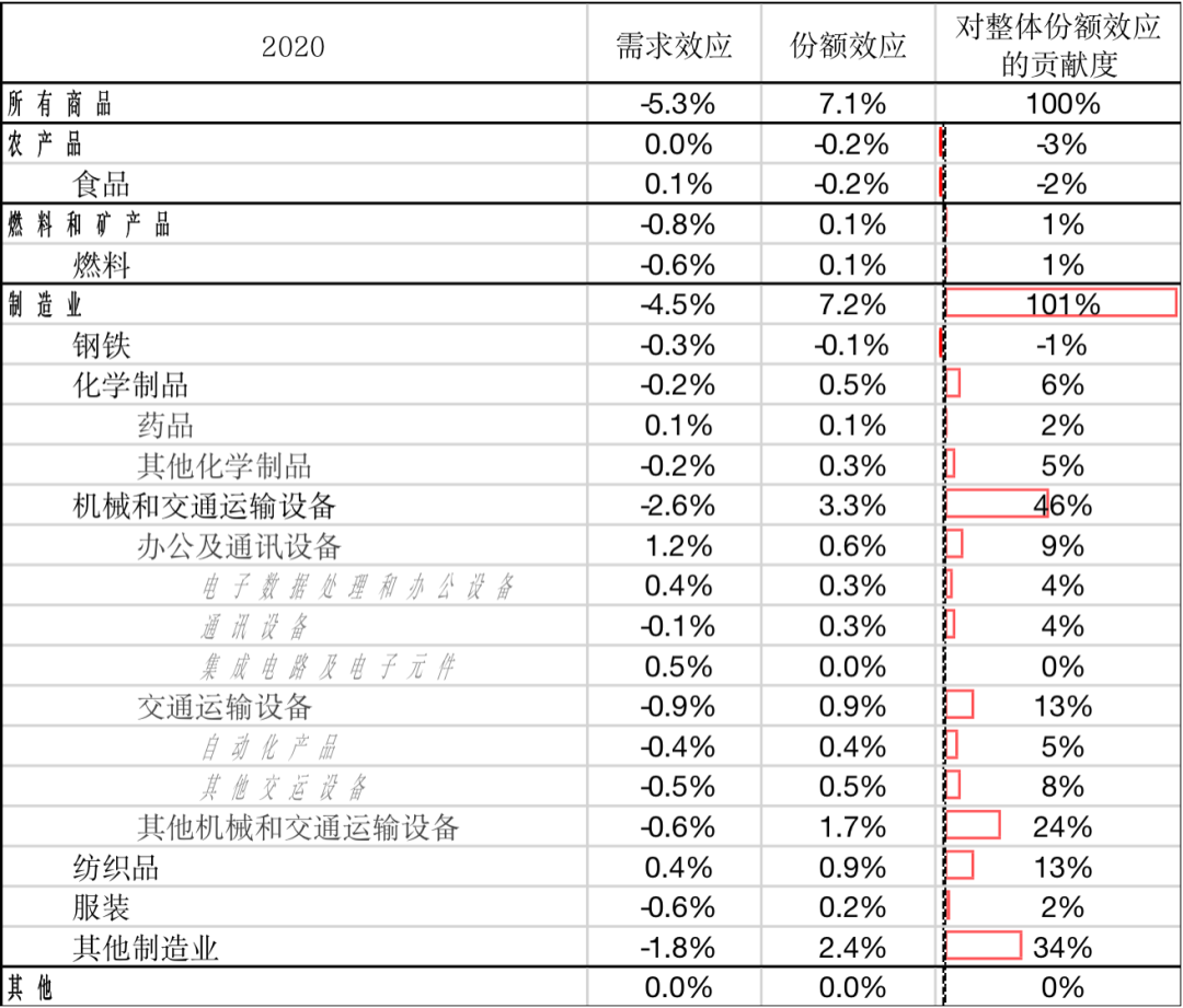 第二个故事是:2021年,外需扩张是推动中国出口高速增长的最主要因素,而份额效应减弱并表现出明显的结构分化。
