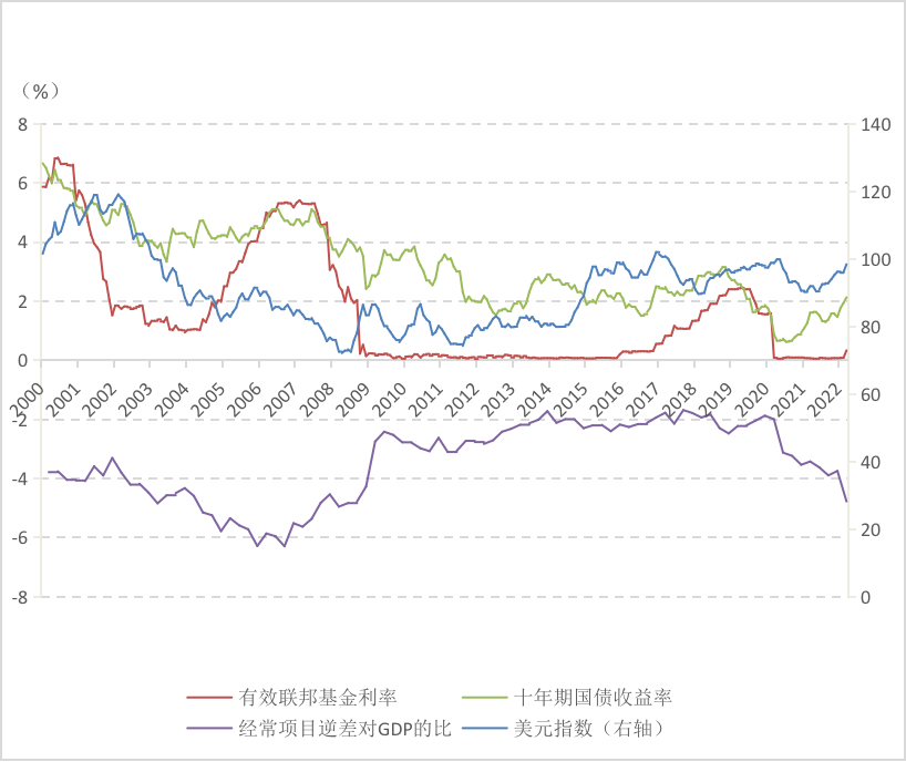 目前美元指数的走强固然离不开美联储的升息,但也应看到,本轮美元指数的回升从2021年6月就已经开始。在当时,美联储并未表示要改变货币政策,美国的国际收支状况也处于持续恶化过程中。