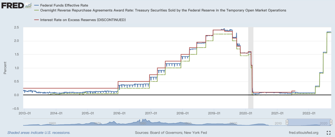 美联储非常有把握地说,不用进行OMOs,仅通过这两个“管理的利息率”就可以把联邦基金利息率控制在一个给定的范围内。例如,现在联邦基金利息率的目标范围是2%-2.5%,而联储决定的IORB利息率和ON RRP利息率两个点利息率基本保证了联邦基金利息率的波动范围确实是在2%-2.5%之间。