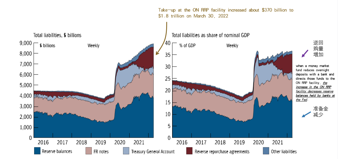 隔夜逆回购量(严格说是“隔夜逆回购便利”存款)增加是ON RRP利息率提高的结果,而非联储以商业银行为对象加大逆回购的结果。特别值得注意的是,在美国,隔夜逆回购并不改变联储负债数量,但可以改变联储的负债结构,即减少联储负债中的商业银行准备金规模,增加非银行金融机构隔夜逆回购便利(ON RRP facility)规模。