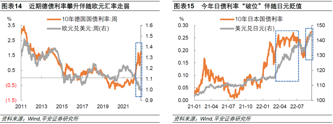 此外,美联储激进紧缩、美债利率再破前高,对非美金融市场的负面冲击或更加剧烈,非美货币表现更受冲击。以欧日债市为例,截至9月20日,10年美债利率突破前高后,10年德国利率也突破前高,刷新2013年以来新高;10年意大利国债利率升至4.15%,处于4%以上的警戒水平;10年日债升至0.274%,连续两周突破0.25%目标水平。欧日债市的压力也将体现在欧元和日元汇率上。总之,无论是从美联储紧缩节奏看,还是从非美经济压力看,美元汇率目前仍将维持强势。