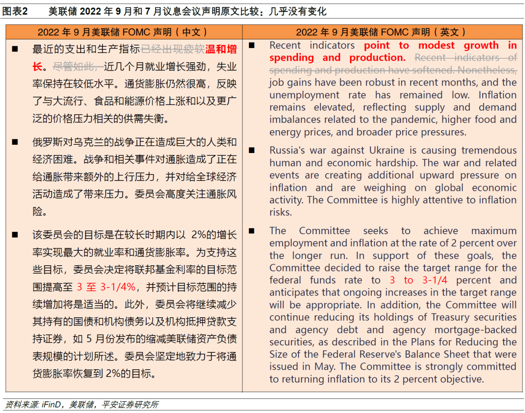 美联储在9月声明中,有关经济和通胀的表述相较7月声明几乎没有变化,仍然强调当前美国通胀很高,地缘冲突对通胀的影响未散,而美联储仍坚定承诺2%的通胀目标,继而选择继续大幅加息。仅有的一处改动是,开篇处关于近期支出和生产指标的表现,从“已经出现疲软”改为“温和增长”。这说明,7月会议后,美国经济活动并未延续下行趋势,反而有所回暖,继而美联储仍有底气选择激进加息,暂不受到经济下行的约束。