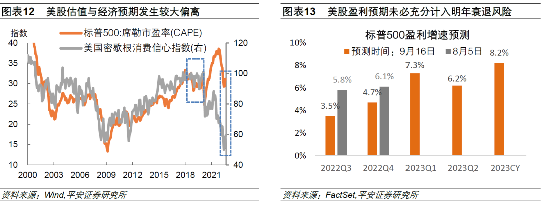 我们认为,美股短期仍有调整压力。一是,美债利率的攀升进一步削弱风险溢价。截至9月20日,美股风险溢价(标普500市盈率倒数与10年美债利率之差)为1.5%,距离近十年均值2.5%已偏离超过一个标准差,处于“危险水平”,美股风险偏好受到显著压制;二是,估值和盈利预期仍有下调空间。从估值预期看,当前席勒周期调整市盈率(CAPE)虽然距离2021年的高点已大幅回落,但仍然略高于2019年疫情前水平。考虑到当下美国居民对经济的预期远弱于2019年(如密歇根消费信心所示),而经济预期与估值预期理应有良好的相关性,美股估值未必已经调整到位。从盈利预期看,据FactSet 9月16日公布的最新数据,近一个月市场已经积极下调今年三、四季度盈利增速预期,但对2023年的盈利预测可能仍然过度乐观:当前市场对2023年标普500公司的盈利增速预期为8.2%,约为今年下半年增速的两倍。换言之,明年美国经济衰退对美股盈利的杀伤依然没有足够计入,美股调整难言到位。