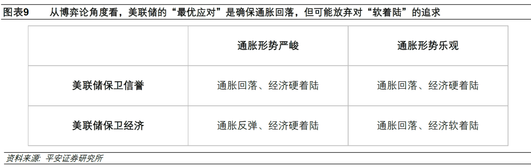 从博弈论角度看,面对美国通胀形势的不确定性,如果美联储对通胀反复的风险是“零容忍”,那么美联储的“最优应对”(Best Response)是坚决加息至通胀实质性回落、放弃“软着陆”的可能性。