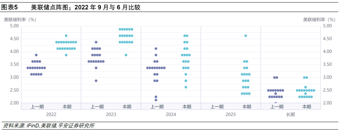 4)利率与点阵图方面,2022年联邦基金目标利率预测中值由3.4%上调至4.4%,且2023年将进一步升至4.6%,2024年和2025年或降息至3.9%和2.9%,即预计未来几年政策利率水平显著高于2.5%的长期预测水平。2022年9月点阵图显示,超过半数委员认为2022年政策利率应至少达到4.25-4.50%,意味着年内的另外两次会议或分别加息75BP和50BP;大约2/3的委员认为2023年政策利率将至少达到4.5%以上,意味着明年至少还有1-2次(单次25BP)的加息;委员们预计2024和2025年政策利率将逐步下调,但仍会高于长期利率;同时,委员们对于2024年及以后的政策利率预测分歧更加明显,或说明美联储对于美国经济衰退的节点和程度难以判断。