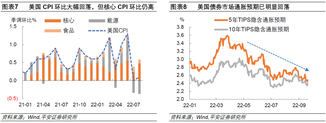 首先,仅就近两个月通胀走势看,美国通胀形势“喜忧参半”,并非单边恶化。从通胀率看,美国CPI通胀率已经连续第二个月回落,CPI环比更已大幅回落。不过,核心CPI环比仍保持高速上升,美国通胀的粘性值得警惕。从通胀预期看,虽然当前美国短期通胀预期仍高、中长期通胀预期也略高于2%,但近两个月并没有明显恶化:9月密歇根1年和5年通胀预期分别回落至4.6%和2.9%;9月克利夫兰联储模型的10年通胀预期为2.35%,低于6月2.40%的高点;最新5年/10年TIPS国债隐含通胀预期已经较6月明显回落,基本处于年内最低水平;牵动通胀预期的大宗商品市场也已降温,WTI原油和LME铜距离6月高点已分别回落30%和20%。
