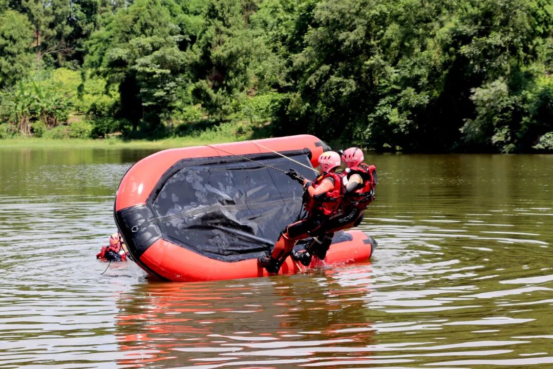 资阳消防开展水域救援演练模拟翻舟自救科目。