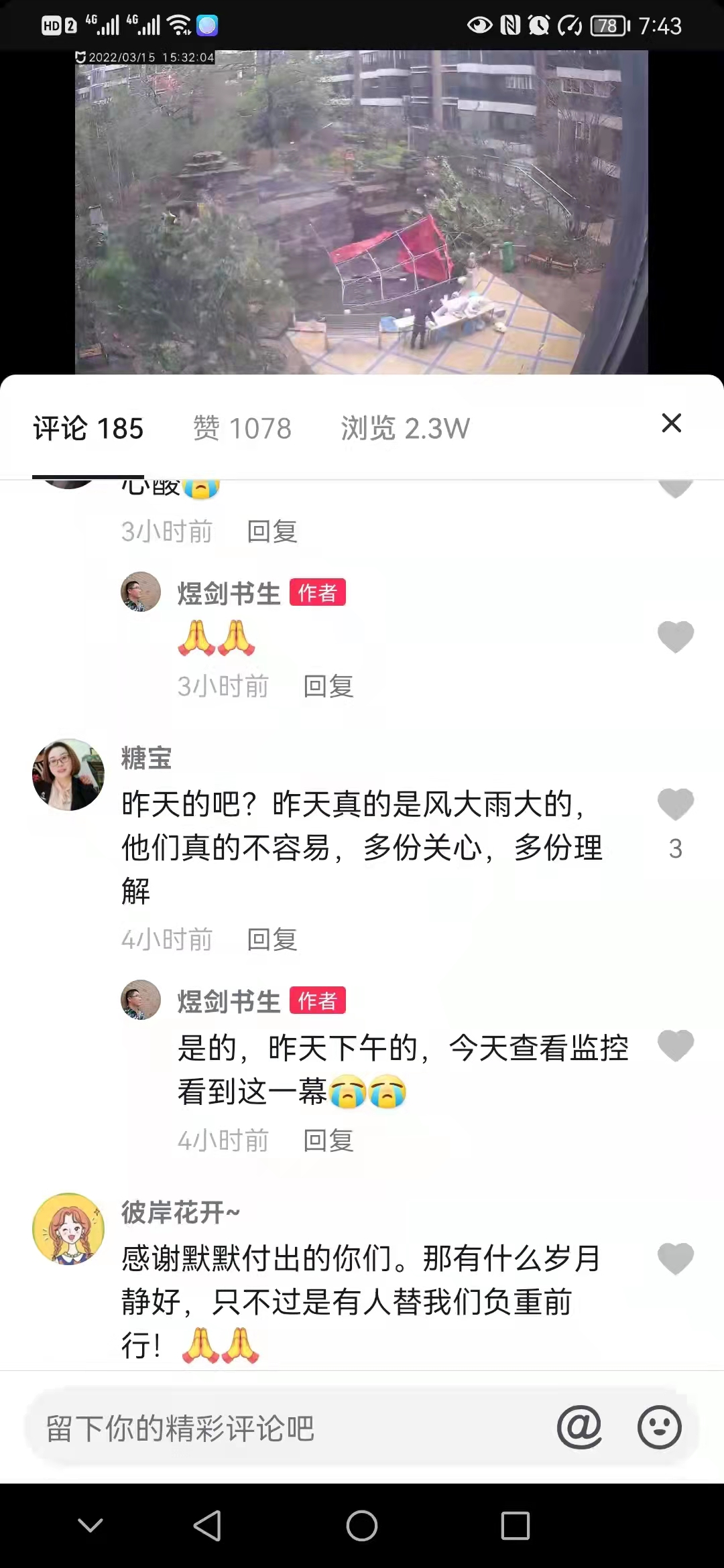 朱先生说,自己截取了这一段发在短视频平台上,以前没怎么点击量,但是这个播放量突然一下子上了几万,点赞都是好几千,下面的评论也是挺多的,都是这个为这些疫情防控人员相关的这些人员叫好的,就感觉他们太不容易了。