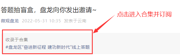 ①点击进入本推文顶端的“盘龙区‘奋进新征程 建功新时代’线上答题”合集并进行订阅,订阅后将在每周二为大家推送答题推文,点击相应推文文末“阅读原文”即可进入答题页面。每周一期,一期5题(单选、多选或判断),持续至12月;