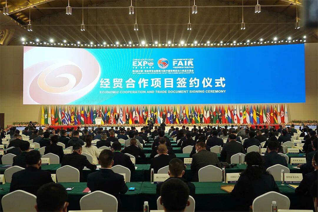 11月20日上午,第6届中国-南亚博览会暨第26届中国昆明进出口商品交易会经贸合作项目签约仪式在昆明滇池国际会展中心七号馆举行。