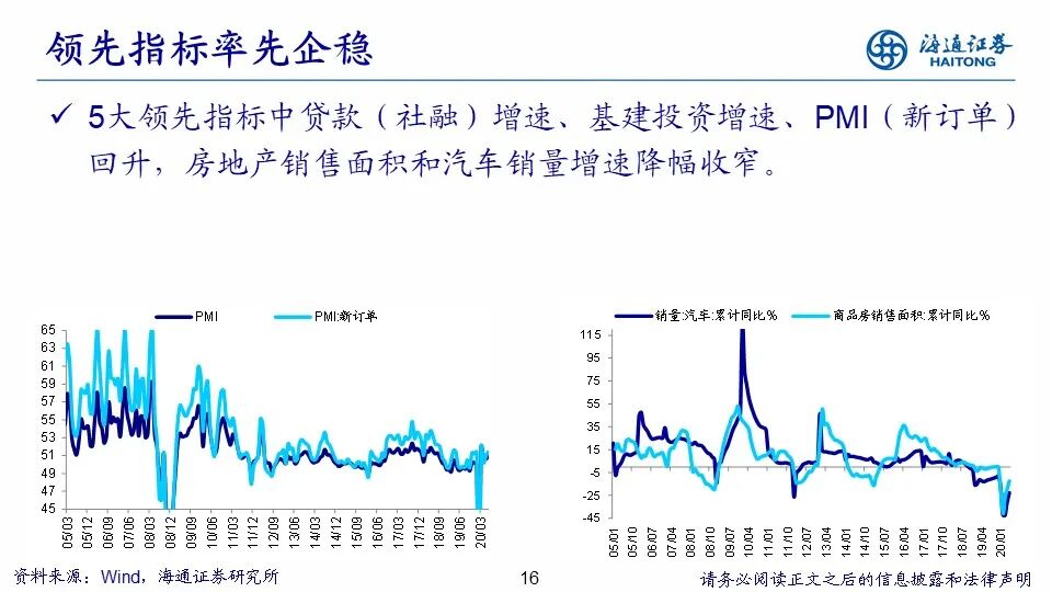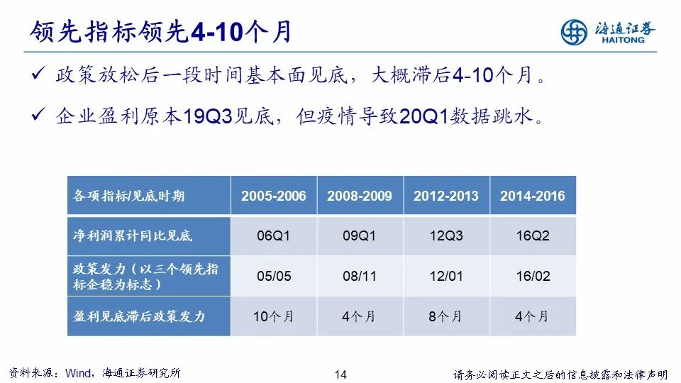 以史为鉴,盈利见底前部分领先指标率先企稳。05年以来A股市场共经历了四次盈利见底回升的周期,参考这四次周期,我们观察到在盈利未出现明显见底趋势之前,部分领先指标已率先企稳,根据性质不同可将其分为五大类:第一,社融存量同比/贷款余额同比,社融/贷款对货币政策变化非常敏感,与流动性密切相关。经济面临下行压力时,货币政策趋于宽松,反之则收紧;第二,基建投资累计同比,为对冲经济下行压力管理层常采取更加积极的财政政策,从而扩大基建投资规模;第三,PMI/PMI新订单,PMI是具代表性的景气指数,反映企业家对制造业的信心,是监测经济运行的及时、可靠的先行指标;第四,商品房销售面积累计同比,地产是代表性的早周期行业,在所有的经济周期规律中,房地产周期又被称为“周期之母”。当经济企稳时地产销量往往快速回暖;第五,汽车销量累计同比,汽车也是早周期行业,当经济企稳时终端需求回暖带动汽车销量企稳。我们发现,每次盈利见底之前都存在三个或三个以上的领先指标出现企稳回升的现象,因此我们将三个领先指标出现企稳的情况定性为领先指标企稳,时间上领先企业盈利见底4-10个月。