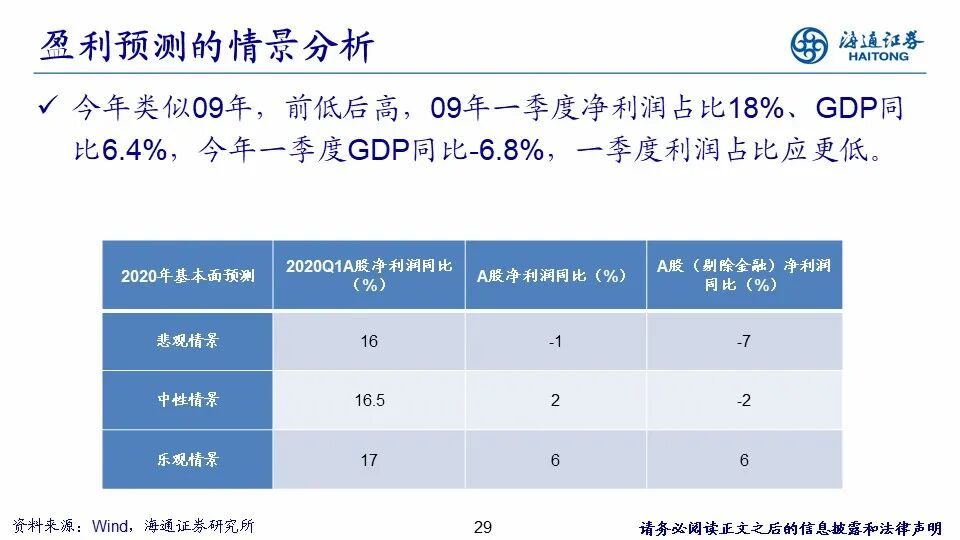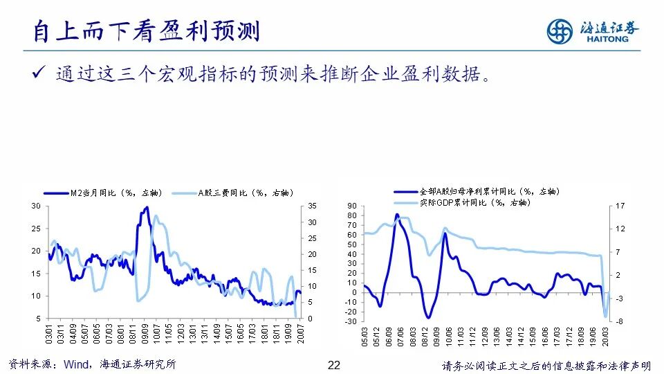 A股盈利预期不断被下调,预计三季度盈利两位数正增长。在海内外新冠肺炎疫情爆发后,A股的盈利预测不断下调。根据Wind一致预期,在19年12月末2020年沪深300、创业板指、创业板指剔除温氏股份净利同比预测为14.5%、80.4%、75.1%,随着国内外疫情爆发,盈利预期不断下调,截至2020/8/14,下调为6.2%、71.5%、64.0%。相比海外,中国疫情控制的更好,为对冲经济下行压力,我国也积极采取了措施应对,从而A股基本面更早开始回升。我们认为驱动基本面回升的因素主要有两个:一是经济周期因素,如果没有疫情,19年3季度末4季度初进入补库存周期,但是,疫情冲击使得基本面 20Q1再砸深坑,现在国内疫情已经得到控制,经济活动将逐步向正常水平靠拢,前期暂缓的生产和消费有望在下半年得到回补,基本面数据有自我回升的动力;二是政策推进,政府工作报告虽然没提GDP目标,但财政赤字和就业目标隐含名义GDP同比5.4%,实际GDP同比3%左右。今年上半年GDP同比为-1.6%,若要实现目标对应下半年GDP同比增速需达到6.5%,由此我们推断下半年财政政策将逐渐落地,随着“两会”开完后政策逐步落地,货币、财政政策发力后将助推基本面数据回升。目前继续等待盈利回升,20Q1受疫情影响,全部A股归母净利润同比增速为-24%,往后我们预计Q2/Q3/Q4三个季度单季同比增速分别为-3%、13%、20%,全年同比仍有望回到0-5%区间,数据有待逐步观察验证。