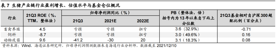 从机构持仓看,21Q3基金重仓股中畜禽养殖市值占比相对沪深300低配0.71个百分点,低于13年以来均值(均值为超配0.24个百分点);饲料和动物疫苗行业相对沪深300超配比例也比较低、分别为0.16、0.08个百分点。从估值看,畜禽养殖PB(LF)处13年以来从低到高32.9%分位、饲料处49.6%分位、动物疫苗处18.3%分位,估值水平偏低。根据海通农业组的预测,22年动物疫苗净利润增速将达20%左右,畜禽养殖和饲料将扭亏。随着基本面反转,生猪产业链望迎来机会,其中畜禽养殖反应更快。
