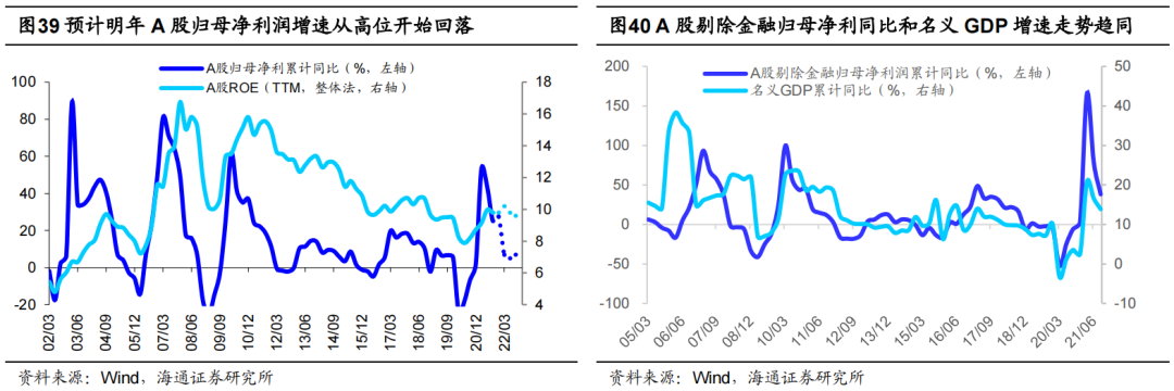我们认为这轮盈利回升周期还没结束,从时间上看,本轮ROE于20Q2见底,20Q3开始回升,至今只持续了5个季度,时间还不够。730政治局会议之后政策开始微调,货币政策边际放松,目前政策逐渐从宽货币走向宽信用,因此这次ROE回升预计可以持续7个季度,预计将持续至2022年一季度,达到10.2%左右。往后看,明年二季度后A股ROE大概率开始步入下行周期,这是因为历史经验显示通胀后期A股ROE将逐步恶化,具体而言:①2006-08年通胀周期CPI上行了25个月(06/04-08/04),PPI上行了28个月(06/05-08/08),通胀前期A股剔除金融ROE持续回升,从06Q1低点7.0%升至07Q4的16.0%,此后开始回落,截止08Q3通胀高点时降至13.5%。②2009-11年通胀周期CPI和PPI均上行了24个月(09/08-11/07),通胀前期A股剔除金融ROE持续回升,从09Q2低点7.5%升至10Q4高点13.6%,此后开始回落,截止11Q2通胀高点时降至13.0%。总体上,在通胀周期进入后期,A股剔除金融ROE开始步入下行周期。这轮通胀周期中,CPI同比低点是20年11月-0.5%,PPI同比低点是20年6月-3.7%,截止21年11月两者分别上行了12、18个月,按照历史经验每轮通胀周期持续2~2.5年,明年一季度后,这轮通胀周期将步入后期,届时A股ROE下行压力加大。