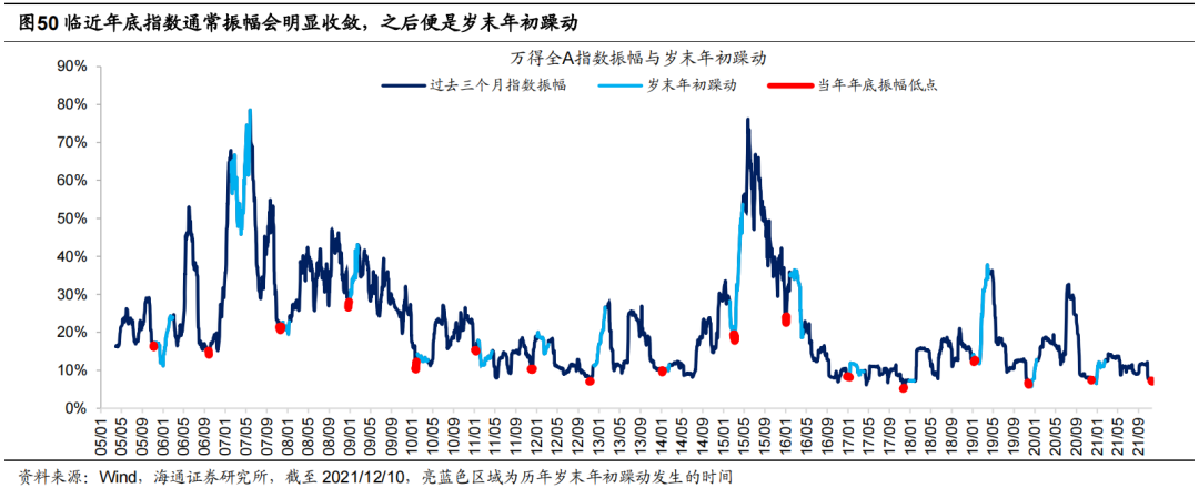 虽然我们预计明年全年股市的预期收益率难以再现19-20年的辉煌,但岁末年初的行情仍值得期待。我们在《如何理解市场的低波动?-20211128》中分析过,当前的市场振幅已创05年以来新低,而回顾2005年以来万得全A指数振幅在年内的规律,我们可以发现指数振幅在年底往往会收敛至低位后便再度扩大,这种扩大便是大家熟知的岁末年初躁动行情。今年11月下旬以来我们在多篇报告中分析过本轮岁末年初的跨年行情或在今年提前启动,原因有三:一是730政治局会议后宽信用政策效果正在显现,居民房贷以及地方政府专项债近期均开始改善。12月8日至10日中央经济工作会议在北京举行,会议要求,明年经济工作要稳字当头、稳中求进,各地区各部门要担负起稳定宏观经济的责任,各方面要积极推出有利于经济稳定的政策,政策发力适当靠前。二是如前所述,当前ROE尚处在回升周期中。三是从历次岁末年初躁动行情回顾来看,跨年行情通常每年都有,背后的原因源自于岁末年初往往是重大会议召开时间窗口,同时11月到3月A股基本面数据披露少,且年初资金利率通常有所回落,开年投资者的风险偏好相对更高。整体看,今年7-10月市场表现比较弱,叠加当前估值尚可,流动性较为充裕,岁末年初的跨年行情值得期待。