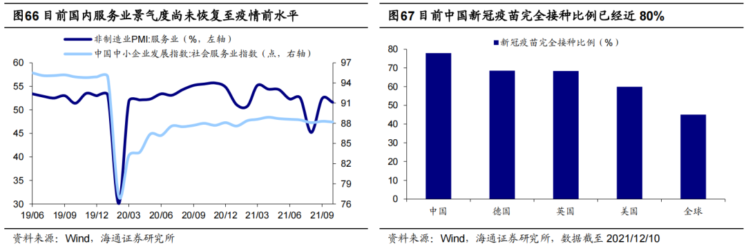 全年结构亮点二:疫情压制行业困境反转。2020年初新冠疫情导致接触式的消费服务行业严重受损,国内服务业PMI从2019/12的53.0%下跌至2020/02的30.1%,中小企业发展指数中社会服务业指数从94.9点下跌至77.2点。新冠疫情发生至今已经达两年之久,期间出现Delta和Omicron等变异毒株使得疫情多次反复。尽管疫情何时结束难以预知,但疫情的影响正在逐渐减弱,全球新冠肺炎死亡比例从2020年4月底高点7.0%逐步下降至今年11月底的2.0%。我们认为疫情终将会过去,明年疫情防控形势也会进一步好转,好转的程度则取决于新冠疫苗接种和特效药研发的进展。目前新冠疫苗普及程度已经较高,截至2021/12/10中国新冠疫苗完全接种人数占比达78%,英国和德国接近70%,美国接近60%,均远高于全球的45%;同时特效药研发也在加快推进,根据央广网援引南方日报报道,我国自主研发的特效药已于12月8日获批上市,该药能使高风险患者住院和死亡风险下降80%。随着疫情逐渐得控,消费服务业也有望迎来更广泛的复苏,根据目前复苏的程度我们将其划分为两类:
