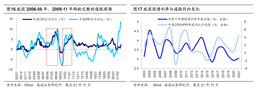 2022年大盘和价值或略优。展望2022年,从整体市场环境来看,我们认为A股在经历19-21年三年上涨后或将迎来阶段性的修整,背后是通胀高位和盈利周期性回落的双重扰动:通胀方面,回顾2000年以来的典型通胀周期,CPI上行周期大约持续2年,PPI上行持续2-2.5年,当前这轮通胀周期中,CPI低点是20年11月-0.5%,PPI低点是20年5月-3.7%,截至21年11月仅分别上行12个月、18个月,从时间维度看,通胀上行周期还未走完。明年随着美欧等发达经济体的复苏趋势进一步确认,国际定价的大宗商品仍存在进一步上涨的驱动力。同时商品的涨价将推升全球通胀预期,美联储加息预期升温,美债利率的中枢上移。美债利率上移叠加通胀的压力,我国国债利率或将难以下行,进而制约A股估值抬升;盈利方面,2002年以来五轮A股的ROE上升周期平均持续6-7个季度,本轮ROE于20Q2见底,20Q3开始回升,预计将于22Q1见顶。明年二季度后A股ROE大概率开始步入下行周期,这是因为如前所述明年我国通胀压力或将进一步发酵,历史经验显示通胀后期A股ROE将逐步恶化,详见《通胀前期盈利上、股市涨-20210516》。