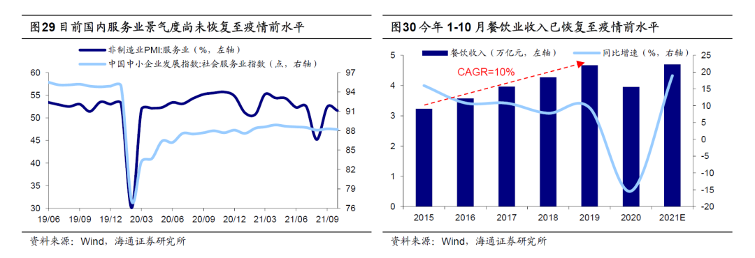 今年以来,相较持续走高的PPI,CPI同比只是温和上行,这主要因为猪价持续下行抑制了CPI的上涨。展望22年,猪价有望于二季度开始上行,将成为CPI上行的主要驱动力。这是因为本轮20年7月开始的猪价下行过程中,养殖户亏损幅度远超此前2轮猪周期,外购仔猪、自繁自养生猪最大亏损分别达1571元/头、771元/头。巨额亏损之下,能繁母猪存栏或已在7月迎来拐点,开始去化进程:能繁母猪存栏同比从6月的25.7%降至7月的24.5%,10月能繁母猪存栏同比继续下降至6.6%;能繁母猪存栏7月环比为-0.5%,这是19年9月以来能繁母猪存栏首次出现下降,10月环比降幅扩大至2.5%。大型养殖上市公司的产能去化时间更早,其中牧原股份等五大养殖公司的生产性生物资产从21Q1开始负增长,21Q3产能去化加速,五家公司生产性生物性资产环比下降11.0%,较二季度扩大约7.5个百分点。结合养殖户亏损情况和能繁母猪存栏量变化,我们认为猪价可能在明年的二季度附近见底回升,或将推动CPI上行。