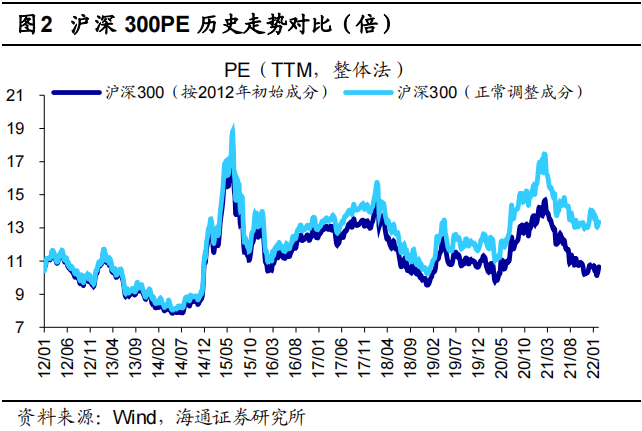 即便考虑最坏的情形,自2019年1月以来沪深300这波上涨已经结束,通过对比历史上市场下跌区间时空对比,我们认为当前沪深300已经调整比较充分。而且,目前沪深300估值不高,从大类资产比价角度看股息率也较具有吸引力。截止2022/2/15,按照正常调整成分股计算,沪深300PE(TTM,整体法,下同)为13.3倍,处于2013年1月来从低到高的65%分位,PB(LF,整体法,下同)为1.61倍、65%分位,若按照2012年初初始成分计算,沪深300PE为10.5倍,处于2013年1月来从低到高的27%分位,PB为1.12倍、9%分位。截止2022/2/15,沪深300最近12个月股息率为2.04%,沪深300股息率/10年期国债收益率为0.73,2013年以来该比值的高点、低点、均值分别为0.96、0.42、0.71,当前处在历史上由高到低47%的分位。