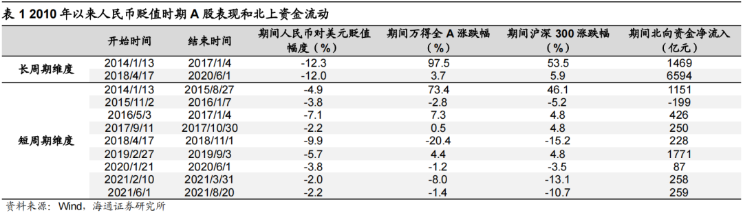 历史上人民币贬值阶段,A股有涨有跌,拉长时间表现为上涨。上述分析表明沪港通开通后人民币升(贬)值与A股走势和北上资金流动在统计学上仅为弱正相关关系,我们进一步选取人民币贬值周期来分析A股走势和北上资金流动。从长周期维度看,2010年以来人民币有2次较大的贬值周期,但由于时间跨度较长,期间A股经历了上涨和下跌过程,区间累计表现均为上涨。从短周期维度看,2010年以来人民币有8次较为明显的贬值小周期,在这8次短周期中A股4次上涨、4次下跌,期间北上资金7次净流入。
