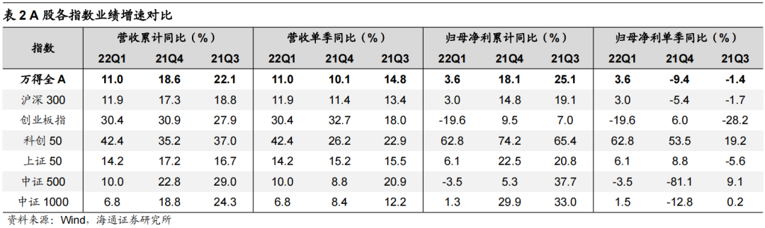 从利润增速看:主要指数盈利增速均下滑,科创50增速依然处于较高水平。22Q1 A股主要指数归母净利润累计同比均明显下滑,其中创业板指22Q1归母净利润累计同比大幅下滑至-19.6%,中证500也转为负增长,代表大盘股的上证50和沪深300相对稳健。尽管各指数盈利增速有不同程度的下滑,但从增速的绝对值看,科创50指数22Q1归母净利润累计同比为62.8%,依然保持在较高水平。换一个角度,如果看单季同比,沪深300、科创50、中证500和中证1000指数22Q1归母净利润单季同比已经有所回升,其中科创50指数早在21Q3就已经触底,目前已经连续两个季度提升。上述数据说明各指数盈利增速均处在下滑趋势,但部分指数边际上出现企稳的迹象,其中科创50最早实现企稳回升。