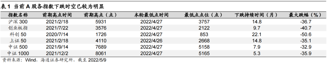 当前A股各指数估值已经处于历史较低水平。我们选取沪深300、创业板指、科创50、上证50、中证500和中证1000这六个重要指数进行对比分析。A股各指数早在2020年年中就开始轮番调整,调整时间并不同步。科创50自2020年7月开始调整,最大跌幅为51%,沪深300和上证50自2021年2月开始调整,最大跌幅分别为37%和35%,中证500自2021年9月开始调整,最大跌幅为33%,创业板指自2021年7月开始震荡至12月大幅下跌,最大跌幅为41%,中证1000自2021年12月开始调整,最大跌幅为36%。