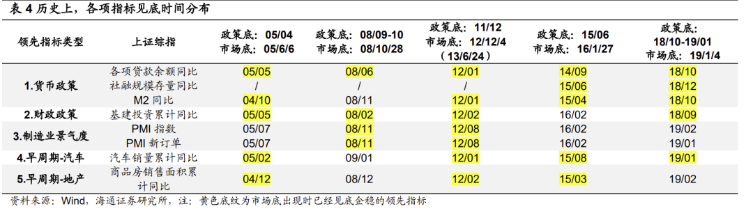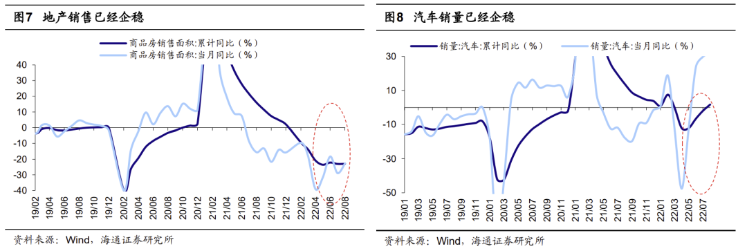 大趋势上,427反转底仍然扎实。我们在《反弹到反转需要啥条件?-20220504》等多篇报告中一直强调,从投资时钟和牛熊周期角度分析,04/27的市场低点是3-4年一次的大底。从前文来看,综合估值、风险溢价、股债收益比等指标,与过去5轮牛熊周期的大底比,04/27时A股估值底已经出现。跟踪市场反转需要找基本面的领先指标验证,我们根据05、08、12、16、19年5次市场见底的经验总结,底部反转均伴随着社融存量同比/贷款余额同比/M2同比(反映货币政策)、基建投资累计同比(反映财政政策)、PMI/PMI新订单(反映制造业)、商品房销售面积累计同比(早周期行业)、汽车销量累计同比(早周期行业)这五大类领先指标中三项及以上企稳,详见下表。4月底时5个基本面领先指标中3个(货币政策、财政政策和制造业景气度)已经回升,即确认市场反转。而近几个月来,汽车销量累计同比已经回升,从4月的-12.1%回升至8月的1.7%,8月当月同比更是达到32.0%,可见5个基本面领先指标中4个已经回升。最后一个指标地产销售面积累计同比正逐步企稳,当月同比已经从4月的低点-39.0%回升至8月的-22.6%,截至10/02,30大中城市商品房成交面积当周同比也回升至21%。因此,目前来看A股在04/27形成的底部区域仍较扎实。