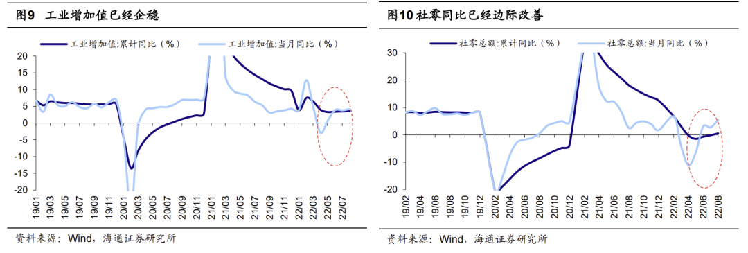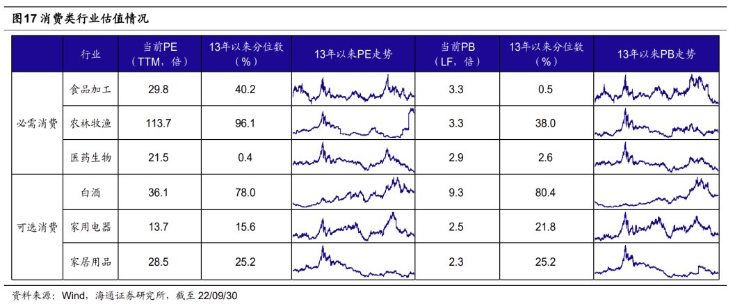 新能源方面,新能源车销售和光伏装机都维持较快增速。①新能源汽车:9月初新能源车销售受到部分地区疫情的负面影响,但随着各地促进汽车消费政策的加速出台、疫情受控区域恢复正常生产生活秩序,9月下旬新能源车销售开始陆续恢复。根据乘联会的预测,9月新能源车零售销量达58.0万辆,同比增长73.9%,渗透率将上升至29.7%。其中,自主品牌正加速崛起,冲击中高端新能源车市场。9月比亚迪新能源车销量达20万辆,同比增长183%,22年以来销量累计同比增长250%。②光伏:今年以来海内外光伏装机持续放量,根据国家能源局,1-8月我国光伏新增装机量同比去年增长102%,光伏电池出口同比去年增长91%。往未来看,能源危机背景下海外光伏装机需求旺盛,政策支持下国内分布式光伏与集中式光伏加速扩容。9月26日能源局提出实施可再生能源替代行动,稳步推进以沙漠、戈壁、荒漠地区为重点的大型风电光伏基地。9月28日发改委等部门印发通知,提出推广“光伏+”模式,在厂区屋顶布置太阳能发电设施。国家能源局预计全年光伏发电新增并网108GW,同比增长95.9%。此外,经历前期的调整,当前新能源产业链估值已经不贵,新能源车PE(TTM,整体法,下同)为24倍,低于4月底时的27倍,也低于19年至今均值的35倍;光伏风电板块PE为30倍,略高于4月底时的26倍,但低于19年至今均值的35倍。
