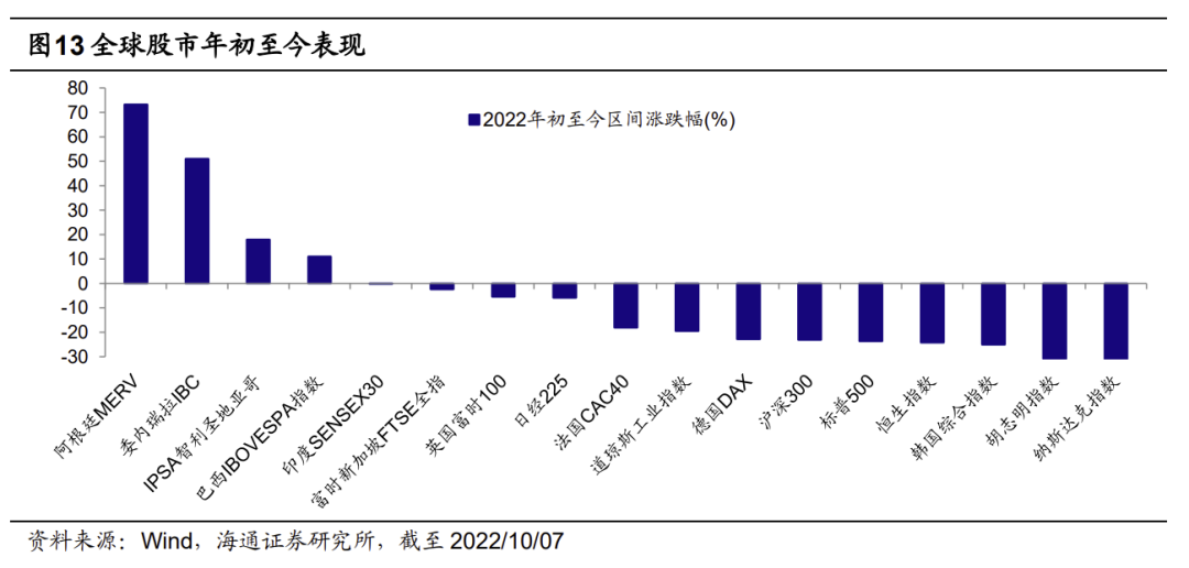 外围因素只是A股的短期扰动,股市的中长期走势最终取决于自身基本面。9月A股下跌较为明显是受到海外加息和俄乌冲突反复的影响,部分投资者担心在当前外部环境依然错综复杂的背景下,未来A股的走势还将受到拖累。我们在《主要经济体宏观周期和股市的分化-20220929》中回顾了全球股市今年表现,尽管大部分市场在俄乌冲突、美联储加息等事件影响下明显调整,但仍有部分地区的股市实现了正收益,例如阿根廷、智利、巴西、委内瑞拉等南美地区。南美国家的股市之所以能走出“独立行情”,主要原因是从宏观经济周期来看,这些国家整体处在经济和通胀均向上的过热阶段,经济基本面较优。而我们在《以史为鉴,以经济周期展望美股可能见底时间-20220823》中分析过,以NBER判断经济衰退的指标来刻画,从技术上看美国经济在今年7月时已经进入了衰退,按历史平均规律来看美国经济衰退或将持续到明年4月,未来美股可能还是偏弱势。
