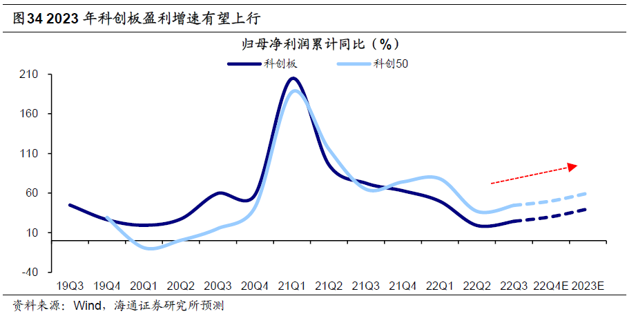 根据上文二三部分的详细分析,从募资-投产-创收的角度看,类似12年创业板,科创板上市公司募资之后已经开始兑现业绩,预计后续将有更多公司释放利润,科创板盈利趋势将整体上行。同时,从主导行业看,新能源景气度持续高增,半导体、医药和软件等行业基本面有望改善,进而推动科创板业绩增长。结合自上而下和中观行业的分析,我们预计2023年科创板整体的归母净利同比增速有望达到40%左右,科创50指数有望达到60%左右,相较2022年均有望实现明显提升。