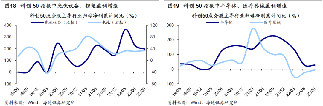 我们进一步看科创板,科创板首批上市公司2019年7月募资金额高达370亿元,此后开始投入,2020年首批上市公司购建固定资产等各项资产的现金流持续高增,全年增速超过100%;在密集性的资金投入下,首批上市公司的在建工程从20年下半年开始快速增加,一直到2021年上半年都维持较高的增速;反映到业绩上,首批上市公司营收和利润增速在2021-2022Q3维持较快的增长,反映出此前的投资开始逐步为公司创造经济回报。结构上,科创板首批上市公司分布在电力设备、电子、国防军工、机械等行业,这些公司的22Q3盈利增速多数高于全部A股各行业的整体水平。根据上述分析,我们认为随着后续更多公司募资投入完成并达产,科创板业绩有望在2023年进一步释放。