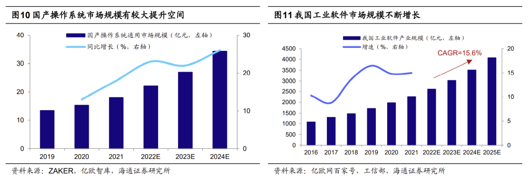 ②软件:软件是硬件之间建立相互联系的枢纽,主要包括基础软件、应用软件。基础软件(中间件、数据库、操作系统等)方面,随着数字技术应用城市场景,基础软件有望迎来新机遇。以操作系统为例,智慧城市为国产操作系统提供潜在的更大增长空间。尽管国外企业在我国桌面操作系统中占据主导地位,根据亿欧智库,Windows、macOS占据国内市场份额超过90%,而国产操作系统在Linux分类占比不超过5%。但当前国产操作系统已在智慧教育、数字政务等细分领域切入市场,例如信创是数字政务的重要构成,其核心是构建以CPU和操作系统为核心的安全自主先进的生态体系,目前政策支持下国产操作系统借助国产化项目和新创产业发展,根据中国产业经济信息网援引《2022年中国操作系统发展研究报告》显示,预计23年国产操作系统通用市场增速将超过20%。应用软件(工业软件等)方面,应用软件是人工智能技术应用的重要领域,针对智慧城市建设中多场景提供相应的信息化应用系统。其中,工业软件是重要市场,随着数字技术与电网、化工等传统行业融合加速,智慧电网、智慧应急等场景需求或爆发,根据亿欧网百家号,25年我国工业软件市场规模突破4000亿。