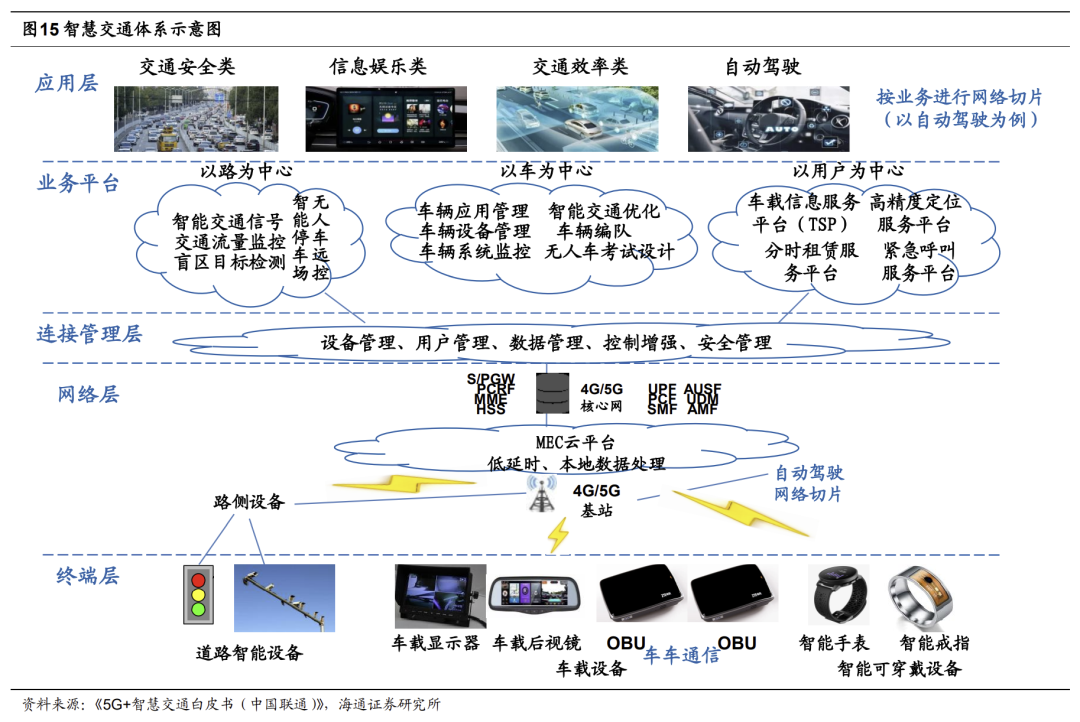 技术驱动下,单车智能和车路协同助力智慧交通落地。近年来ADAS(先进驾驶辅助系统)技术取得了明显突破,自动紧急制动、车道保持辅助等功能已经相当成熟,能够覆盖L1-L2级别的自动驾驶,成为大量上市新车的标配。根据高工智能汽车公众号,21年我国前装ADAS标配新车上险量为808万辆,同比增长30%。但单车智能存在单车算力不足、成本过高、感知距离相对较近的缺陷,发展更高级别的自动驾驶难度较大,车路协同或成为解决方案。C-V2X是车路协同的核心技术,通过C-V2X车载终端设备(OBU)及智能路侧设备(RSU)的多源感知融合,对道路环境实时状况进行感知、分析和决策,以实现自动驾驶。5G和边缘计算等技术正加速C-V2X的落地:5G网络具有低时延、高带宽、广域覆盖的特点,是实现车路协同的基础。截至22/08,我国已累计建成并开通5G基站210.2万个,奠定了车路协同的网络基础;车联网产生的数据量较大,边缘计算靠近终端,能够快速处理部分非结构化的数据,形成快速反馈,可以降低云计算中心的数据储存量和计算量。