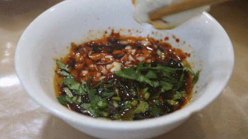 吃豆花饭,蘸水也很重要,老板的特调蘸水会根据顾客口味调整辣度,香菜、葱花、酱油、红油辣椒……是点睛之笔亦是不可或缺。
