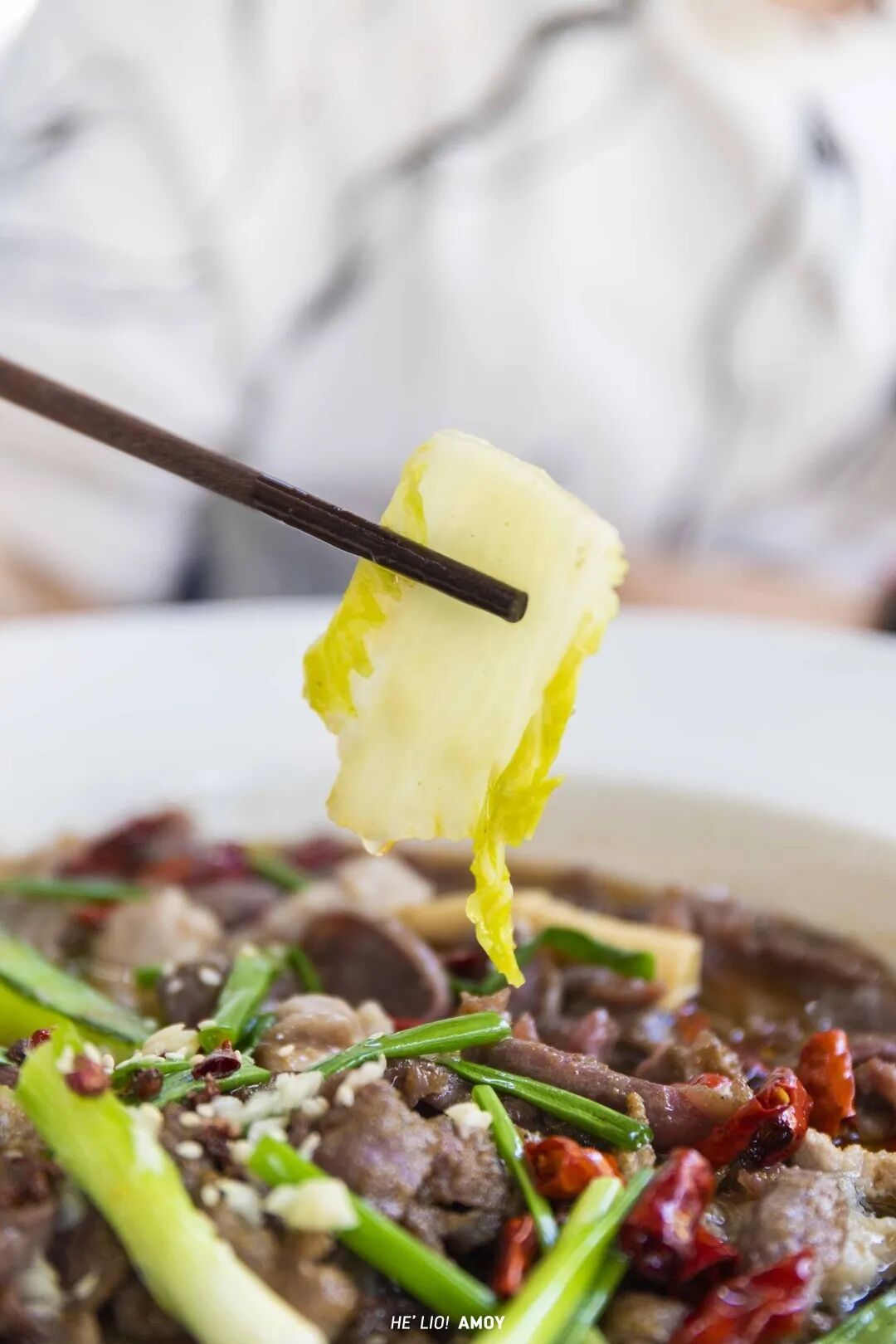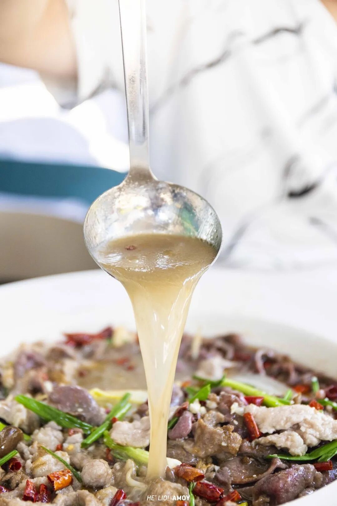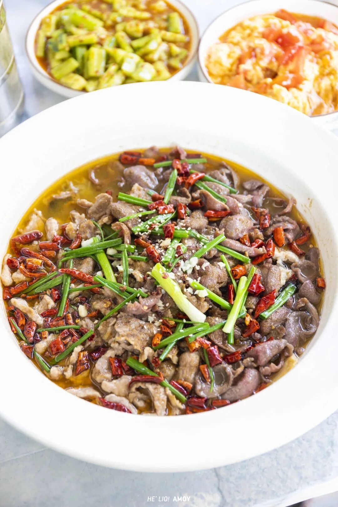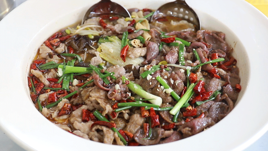 辣椒、花椒、孜然……在热油的刺激下,将香气大量释放,滑溜的肉片,也接受了这份历练,轻轻蘸入,让香与辣的气息一同与肉片缠绵,一入口就让椒麻香辣,占据整个味蕾。