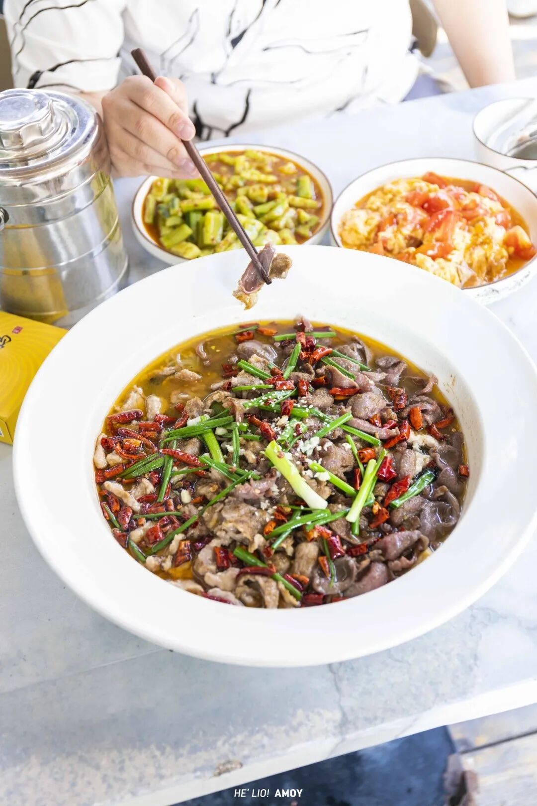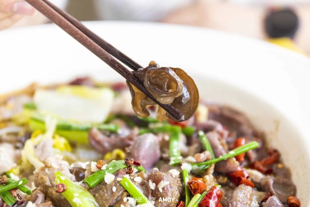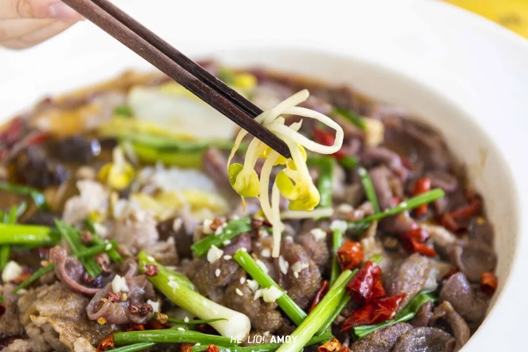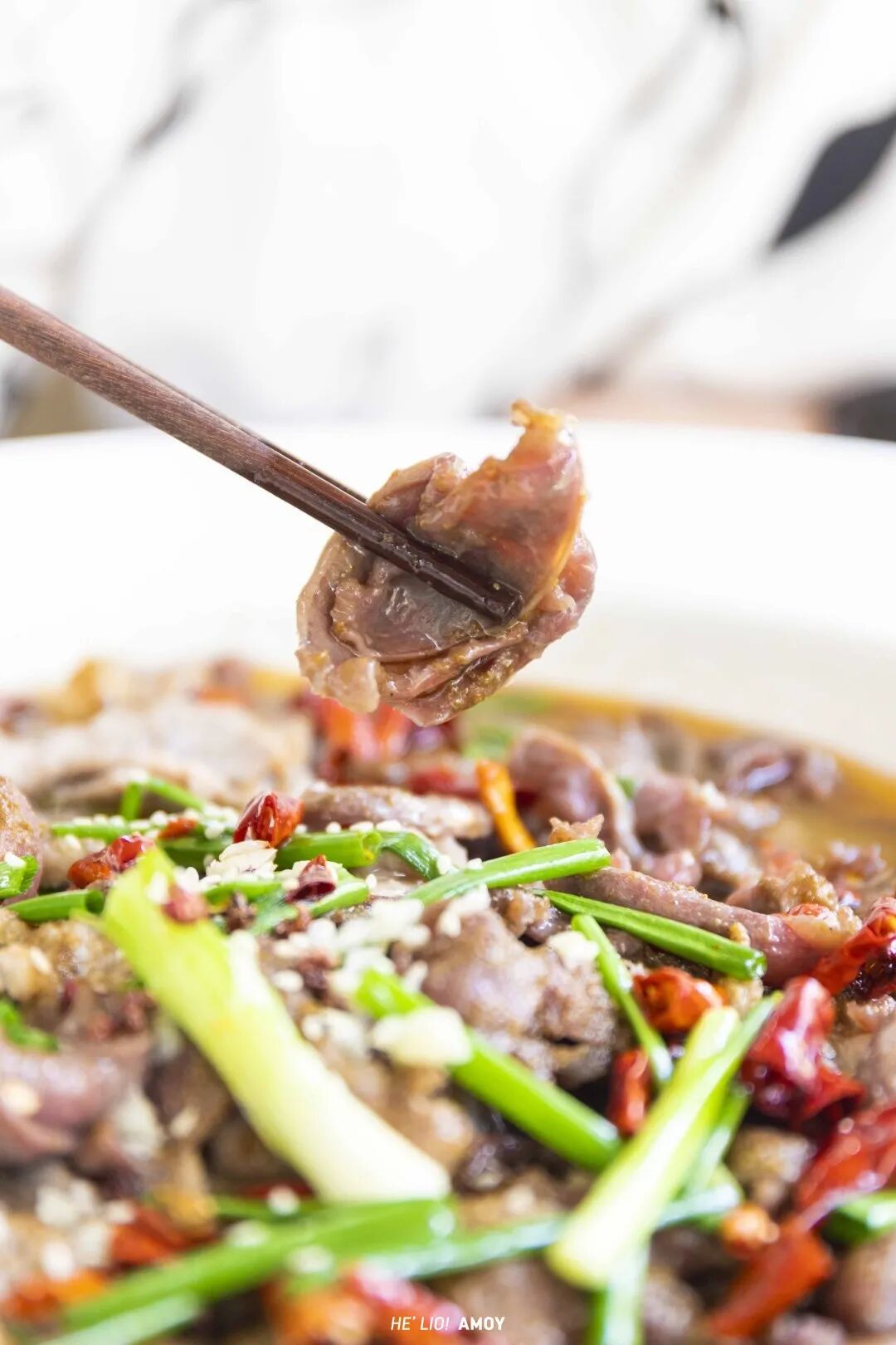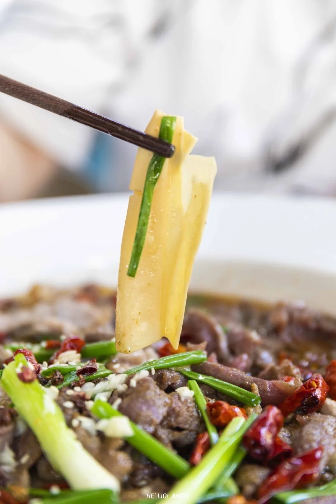 辣椒、花椒、孜然……在热油的刺激下,将香气大量释放,滑溜的肉片,也接受了这份历练,轻轻蘸入,让香与辣的气息一同与肉片缠绵,一入口就让椒麻香辣,占据整个味蕾。