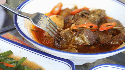 浓郁鲜香的汤汁,搭配大块牛肉,还有土豆,点缀上红椒圈和香茅根,端上桌的一刻,好料菌就已经折服于这阵香气之中。嘘~把这个汤汁浇在姜黄饭上,也是相当delicious的!