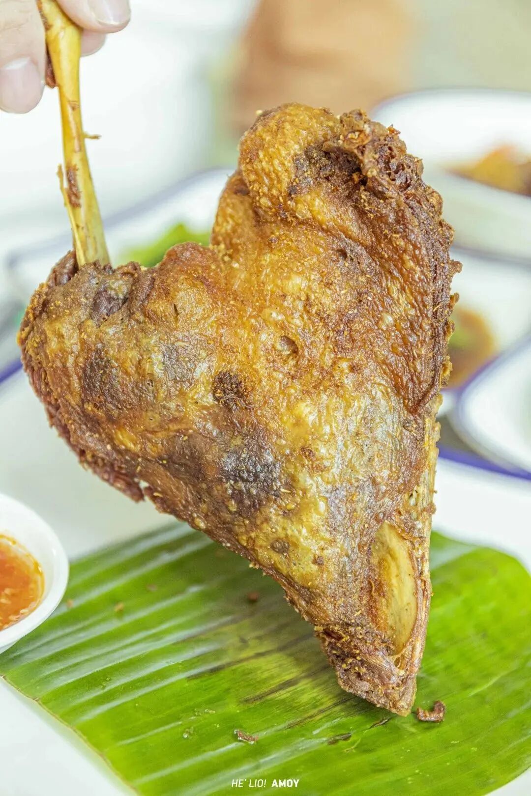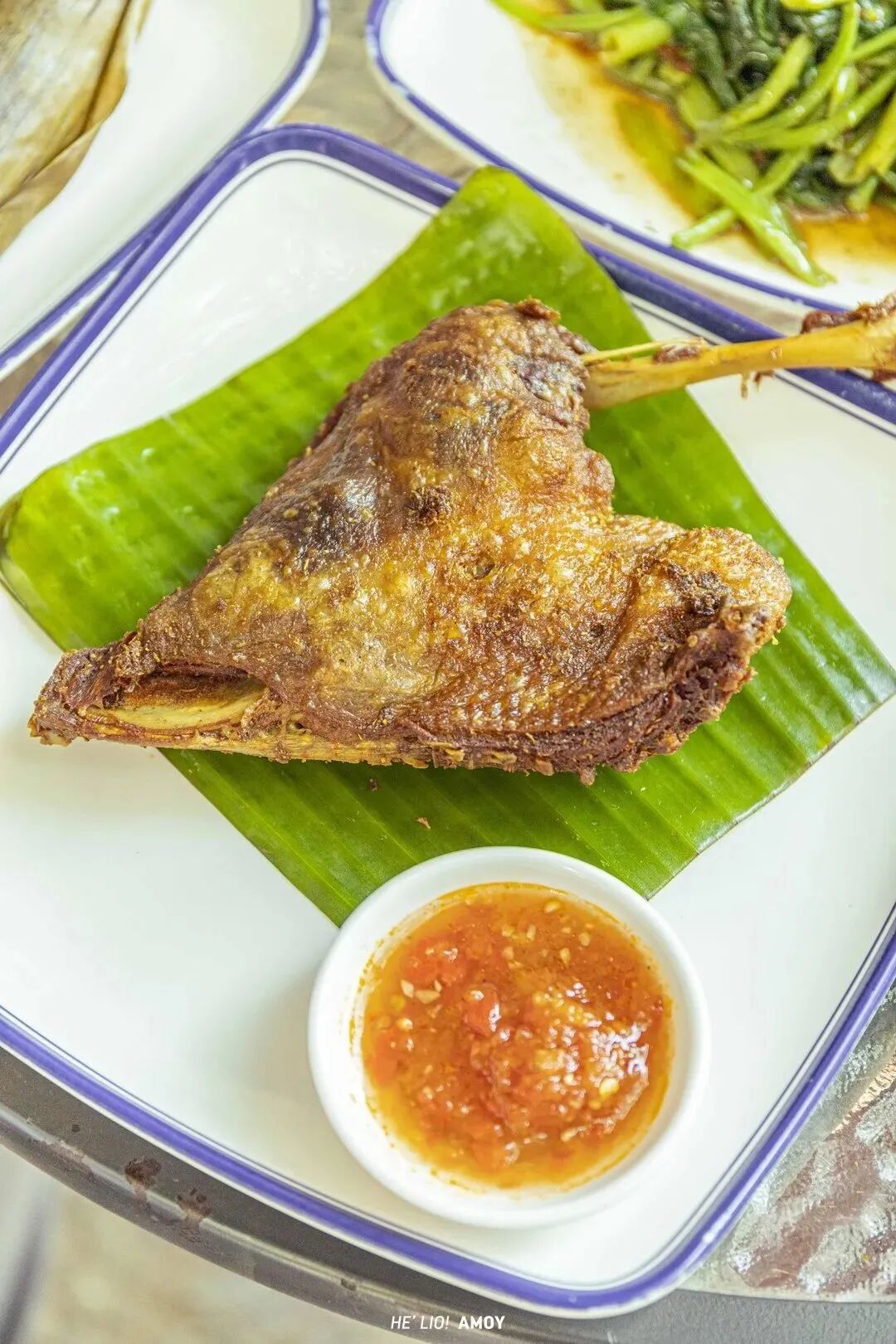 同样是事先腌制入味,再经过多个制作步骤,才能拥有这支焦香酥脆的“脏鸭腿”。附带的料汁,鲜红的颜色好似辣得喷火,但其实辣味并不算重,各式香料的调制,让酱汁带有丝丝鲜香与甜味,与酥香的鸭腿,达到了一种中和……