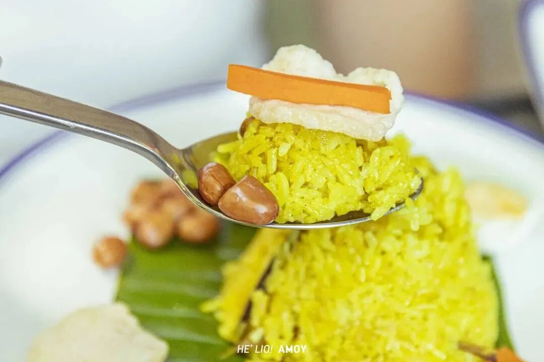舀起一大勺,搭配一旁附带的虾片、萝卜、花生……一众配料一同入口,姜黄的清香,刹时占据整个口腔,清脆的配料,一同于口中“混战”,微辣、鲜香、生脆,多种口感在嘴里扩散,一口就能体验多种风味。
