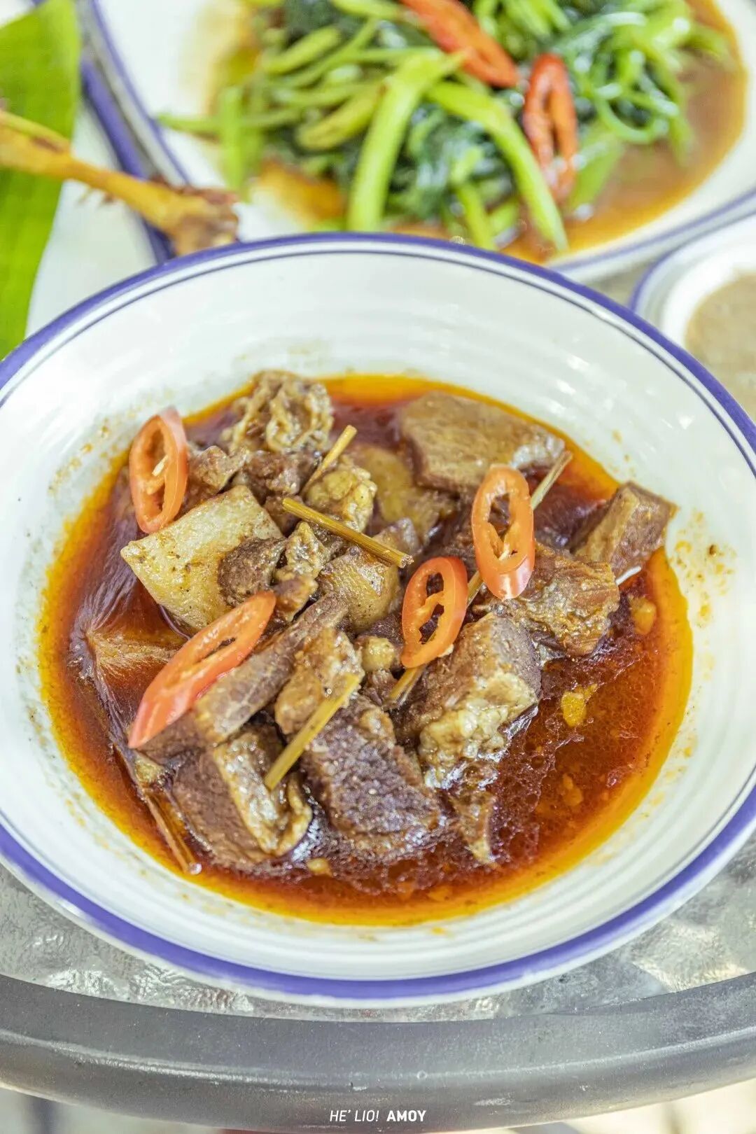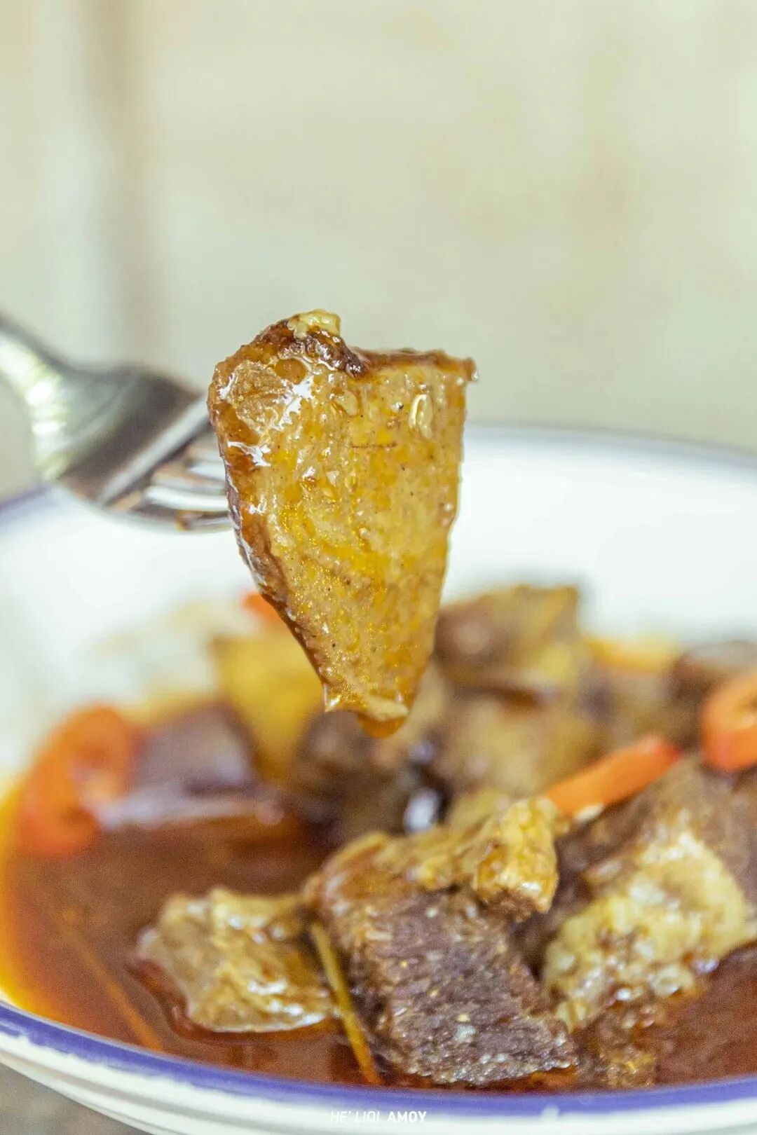 沾上些许汤汁,让其深入牛肉的每一丝纹理之中,炖煮到柔韧却不松垮,在适度的软度之中还有些许的嚼劲,一入口,轻轻咀嚼,轻易就能散开,汁水倏地就在口中迸发,根本来不及反应。
