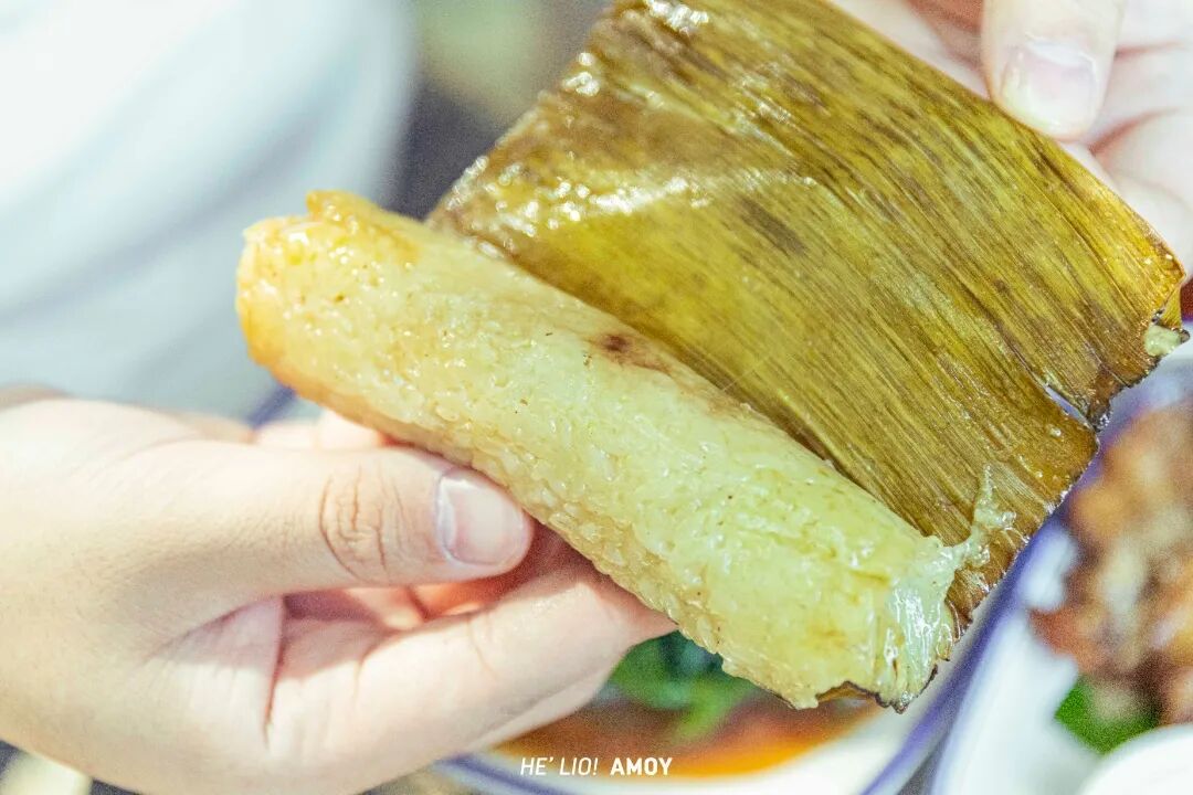 外表其实与闽南肉粽没有太大区别,翠绿清香的粽叶,包裹着绵软细腻的糯米,一剥开,就有一阵清新的味道侵入鼻腔,隐约中有丝丝的肉香、油香,还未开吃就令人垂涎。
